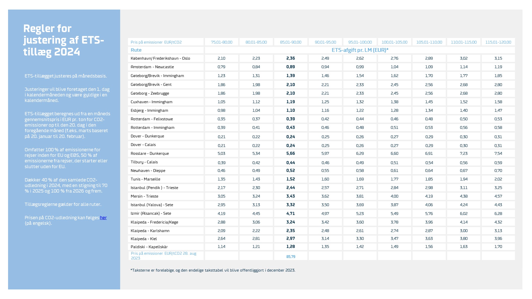 ETS-tillæggene vil fortsat blive justeret månedligt, hvilket afspejler de forventede fragtmængder og emissioner for hver rute.