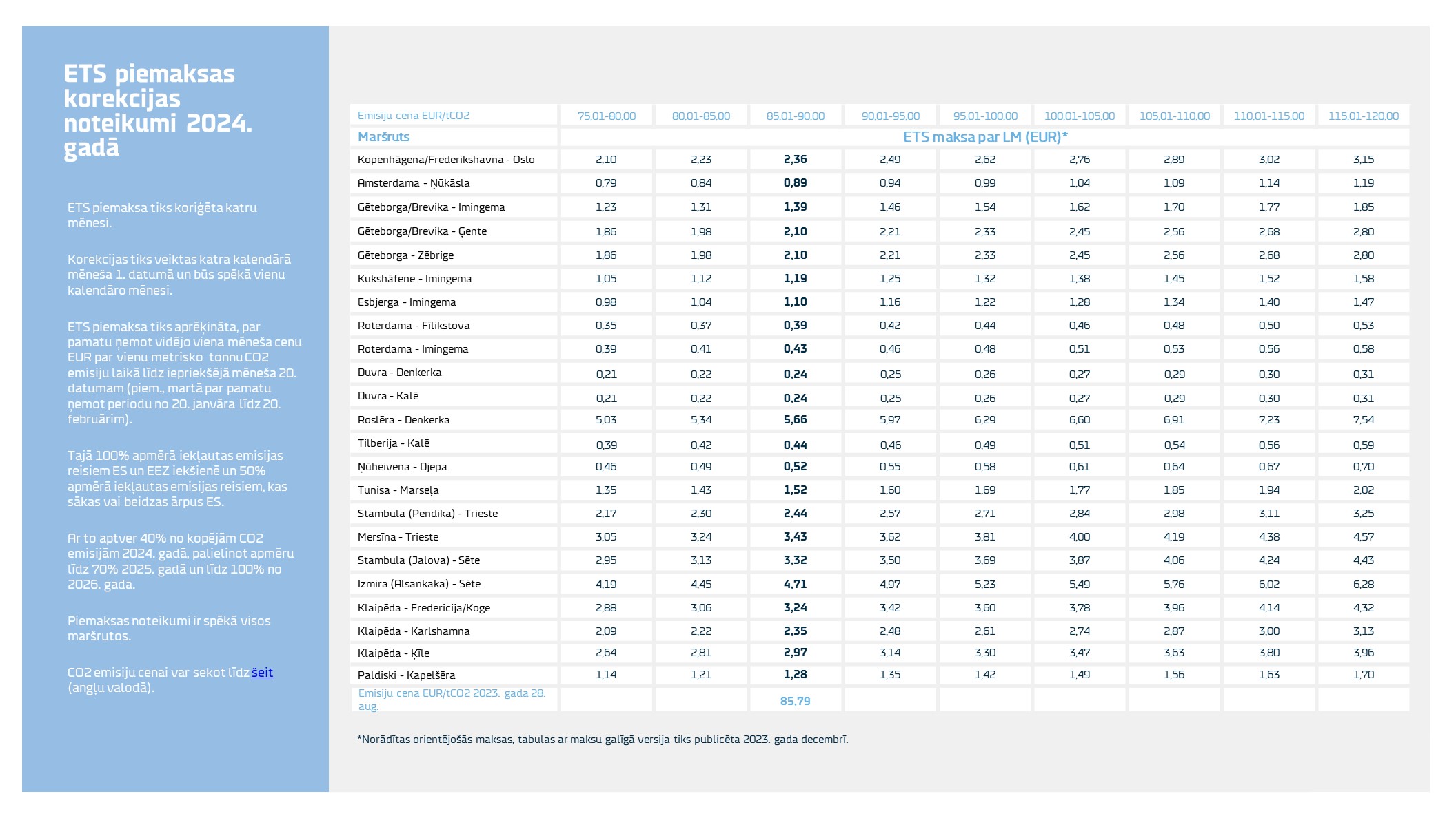 ETS maksas arī turpmāk tiks pielāgotas katru mēnesi, atspoguļojot prognozētos kravu pārvadājumu apjomus un emisijas katrā maršrutā.