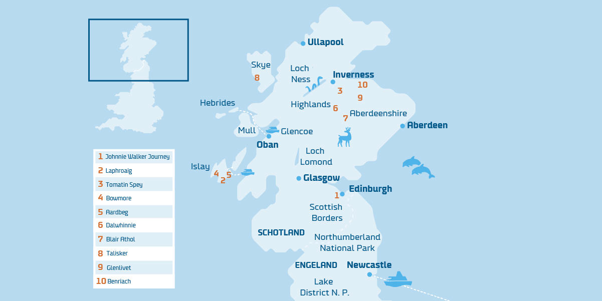 Begin in Edinburgh, dat vanuit Newcastle goed te bereizen is. Hier dompel je je onder in de Johnnie Walker Princess Street en natuurlijk in de rest van deze prachtige stad. Want Edinburgh is veel te mooi om alleen voor whisky te bezoeken. Met een auto pak je daarna de route naar Inverness. Dit is een tocht van zo’n drie uur door de Schotse Hooglanden, die van zichzelf al erg de moeite waard zijn. Onderweg, zo’n beetje halverwege, kom je de Blair Atholl en Dalwhinnie distilleerderijen tegen. Tomatin Spey is de derde distilleerderij die je onderweg tegenkomt, net onder Inverness.
