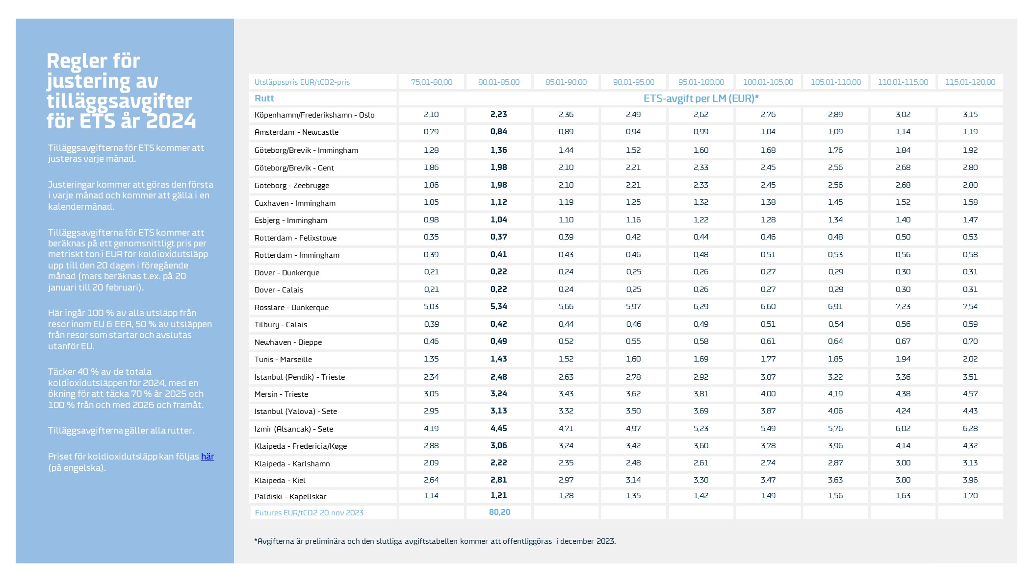 I likhet med tidigare regleringar kommer vi att införa en tilläggsavgift på marknaden för att täcka de ökade kostnader som EU har infört. Kunderna kommer därför att behöva betala en fristående tilläggsavgift från och med 1 januari 2024.